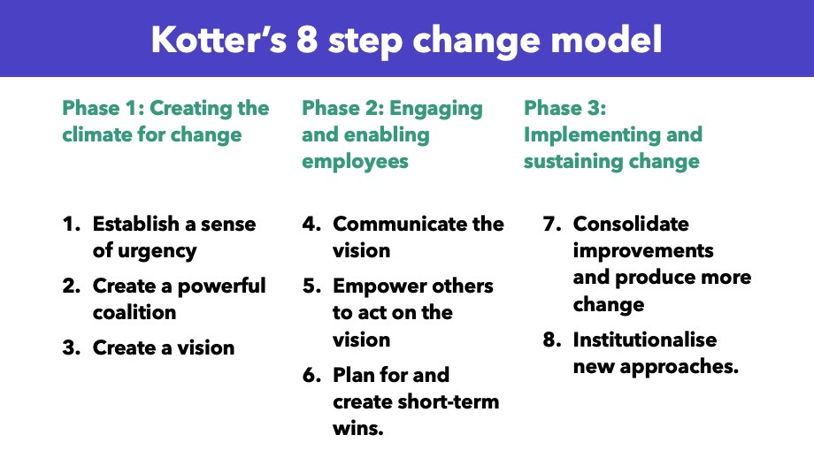 Kotter’s change model aims to give organisations a road map to follow when they seek to bring about major change.